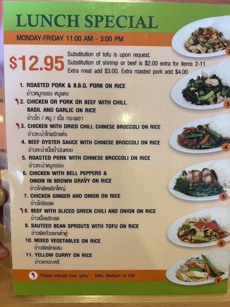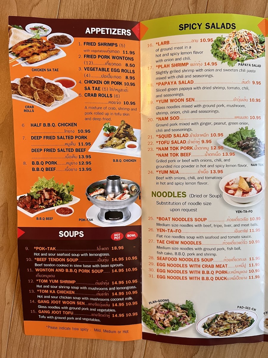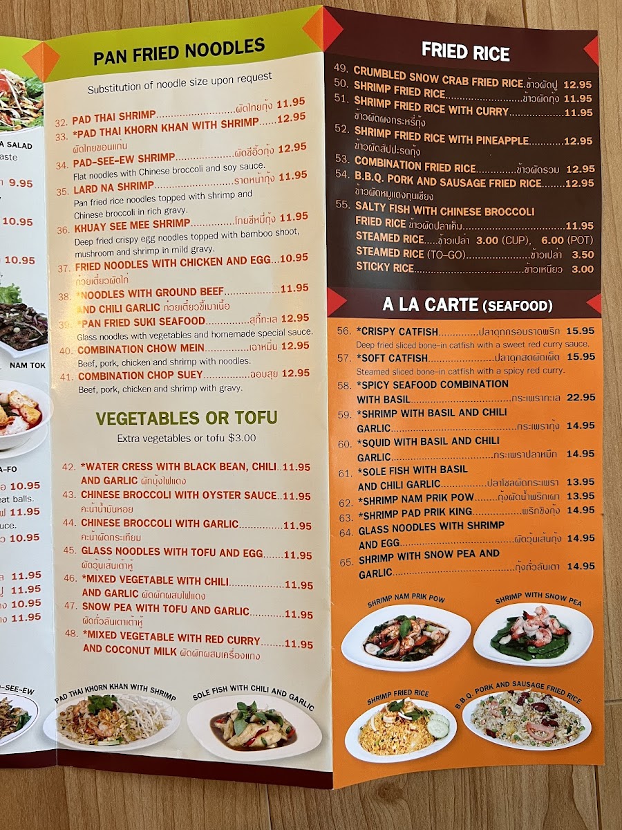 Beverages typically include Thai Tea among other drink options to complement the meal. The menu is suited for casual dining with a focus on authentic Thai cuisine, catering to those seeking either a quick order or a fuller meal experience. Please note that the restaurant operates on a cash-only basis.