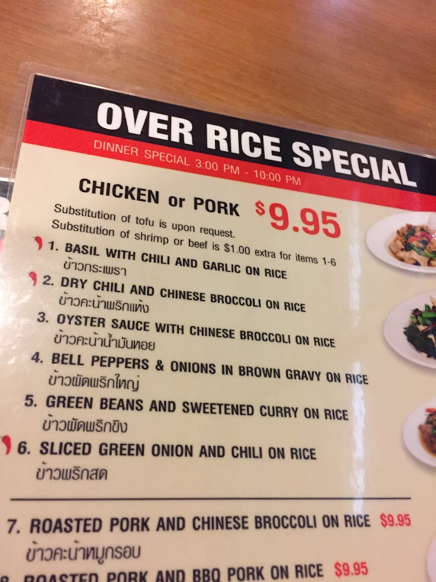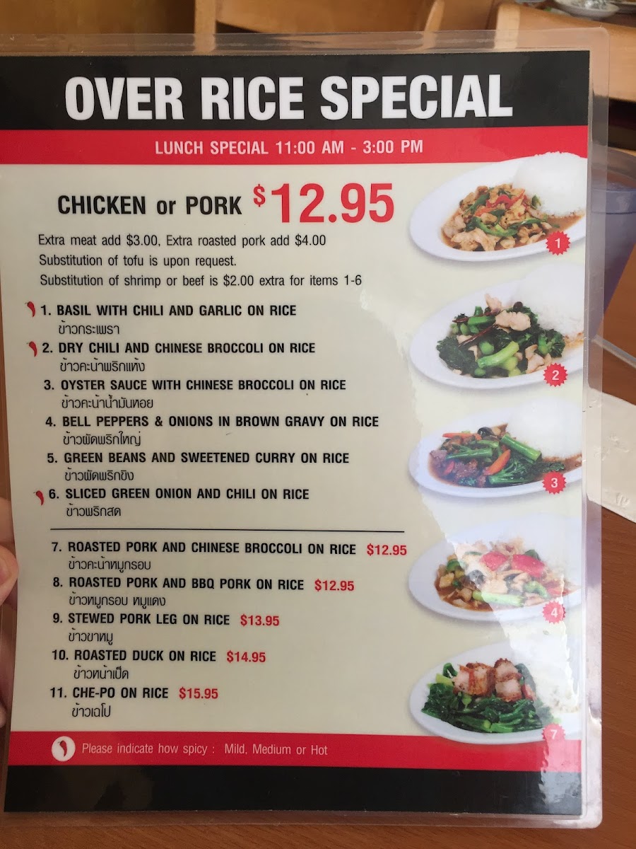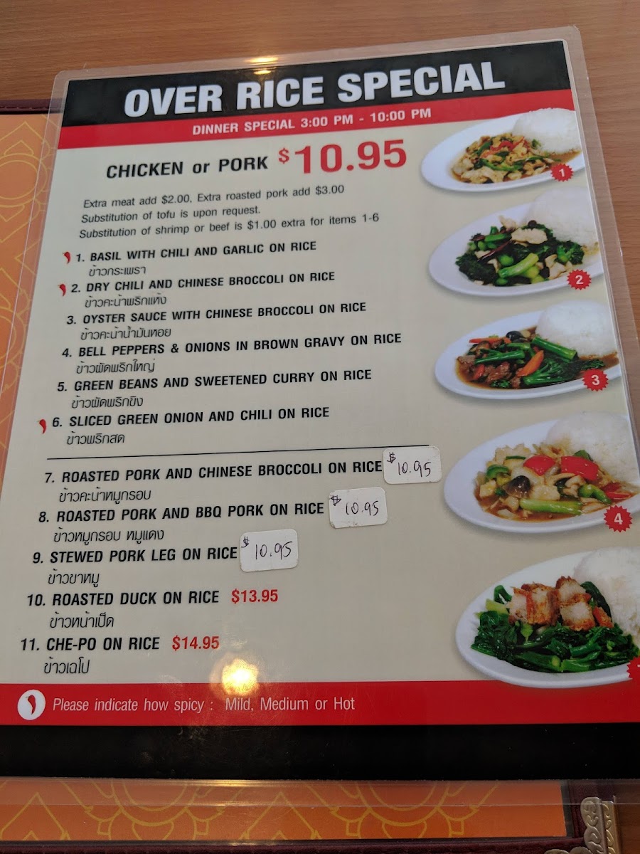 Beverages typically include Thai Tea among other drink options to complement the meal. The menu is suited for casual dining with a focus on authentic Thai cuisine, catering to those seeking either a quick order or a fuller meal experience. Please note that the restaurant operates on a cash-only basis.