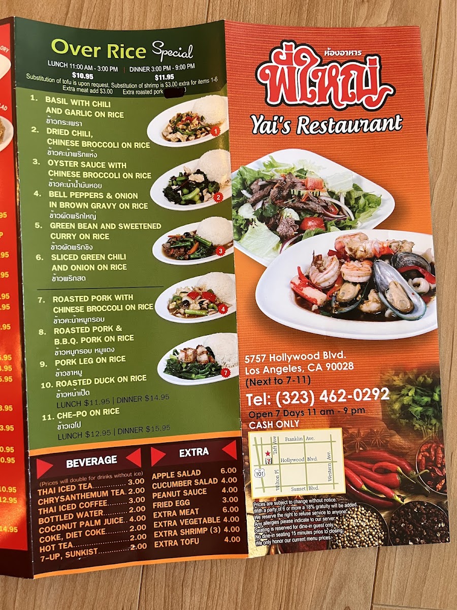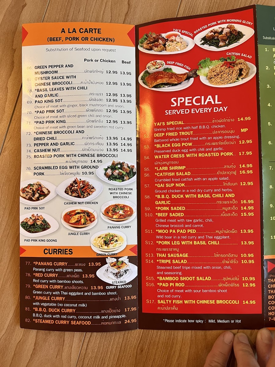 Main dishes are highlighted through daily specials, including Yai’s Special (shrimp fried rice with barbeque chicken), Steamed Curry Seafood, Panang red curry, BBQ Duck Curry, and Pork Leg with Chili Garlic. The menu also offers well-known traditional plates such as Drunken Noodles, Papaya Salad, Pad Thai Noodles, Crab Fried Rice, Nam Tok Beef Salad, and Boat Noodles Soup.